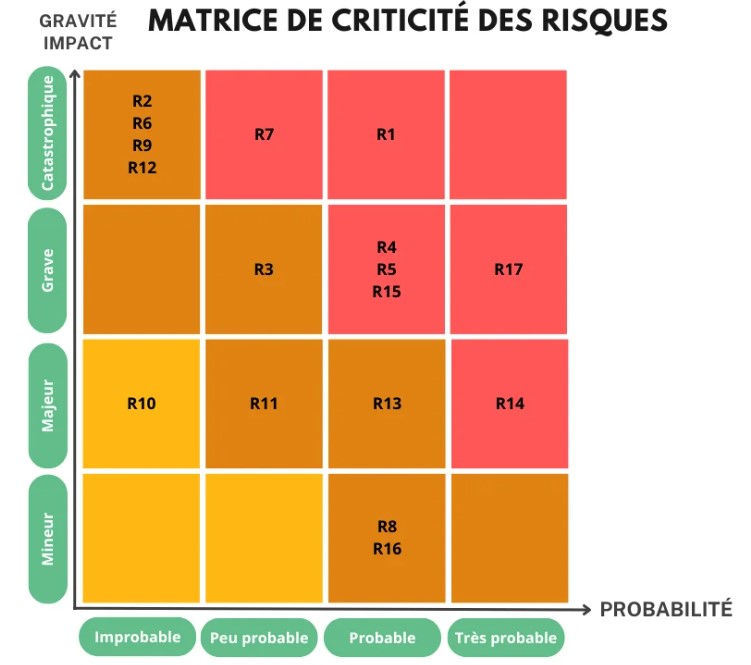 Après l’identification des risques, l’équipe évalue leur probabilité et leur impact. Dans cet exemple, le risque lié aux changements de besoin pourrait avoir un impact élevé en termes de coûts et de temps, avec une probabilité moyenne.